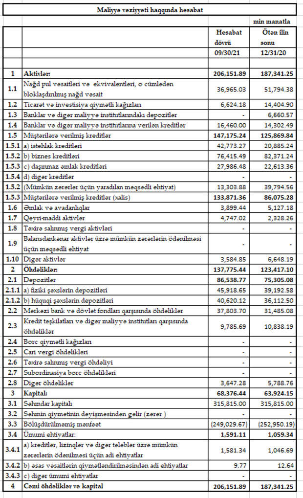 Hesabat dövrünün sonuna bankın öhdəlikləri 137 milyon 775 min manat (artım 11,6%), depozit portfeli 86 milyon 539 min manat (artım 14,9%), o cümlədən fiziki şəxslərin əmanətləri 45 milyon 919 min manat təşkil edib (artım 17,2%).