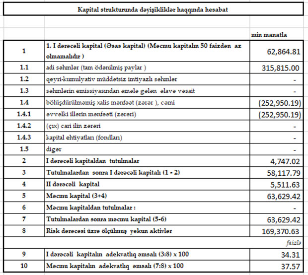 Oktyabrın əvvəlinə bankın kapitalı 68 milyon 229 min manat (artım 6,96%), nizamnamə kapitalı 315 milyon 815 min manat (dəyişməyib) təşkil edib.