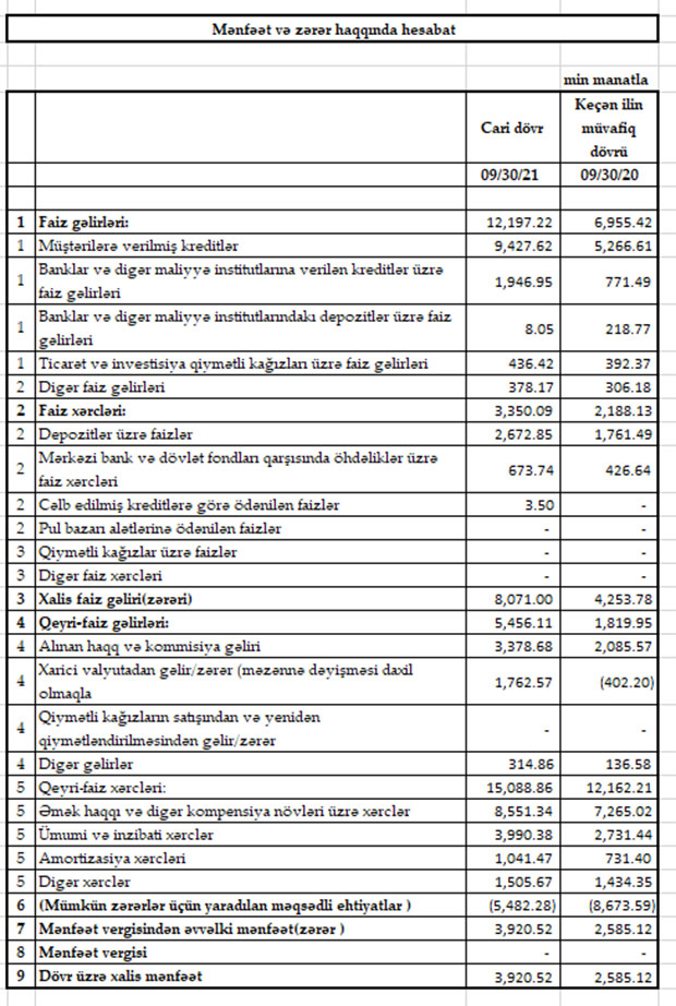 9 ayda fəaliyyətinin yekunları üzrə bankın xalis mənfəəti 3 milyon 920 min manat təşkil edib.