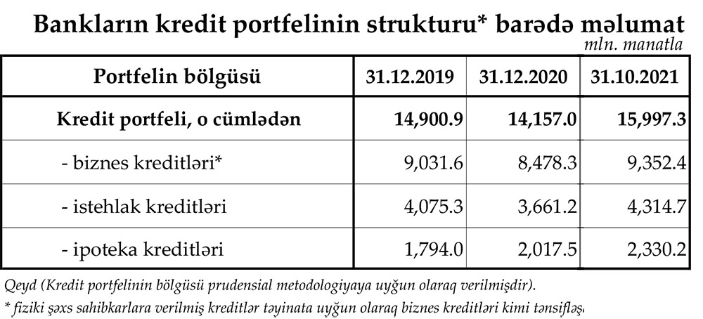 Azərbaycanın bank sektorunun cəmi kredit portfeli (müştərilərə verilmiş cəmi kreditlər) 2021-ci ilin sentyabr ayı ilə müqayisədə oktyabr ayında 458,6 milyon manat, 2020-ci ilin sonu ilə müqayisədə (10 ayda) isə 1 milyard 840,3 milyon manat artaraq 15 milyard 997,3 milyon manata çatıb.