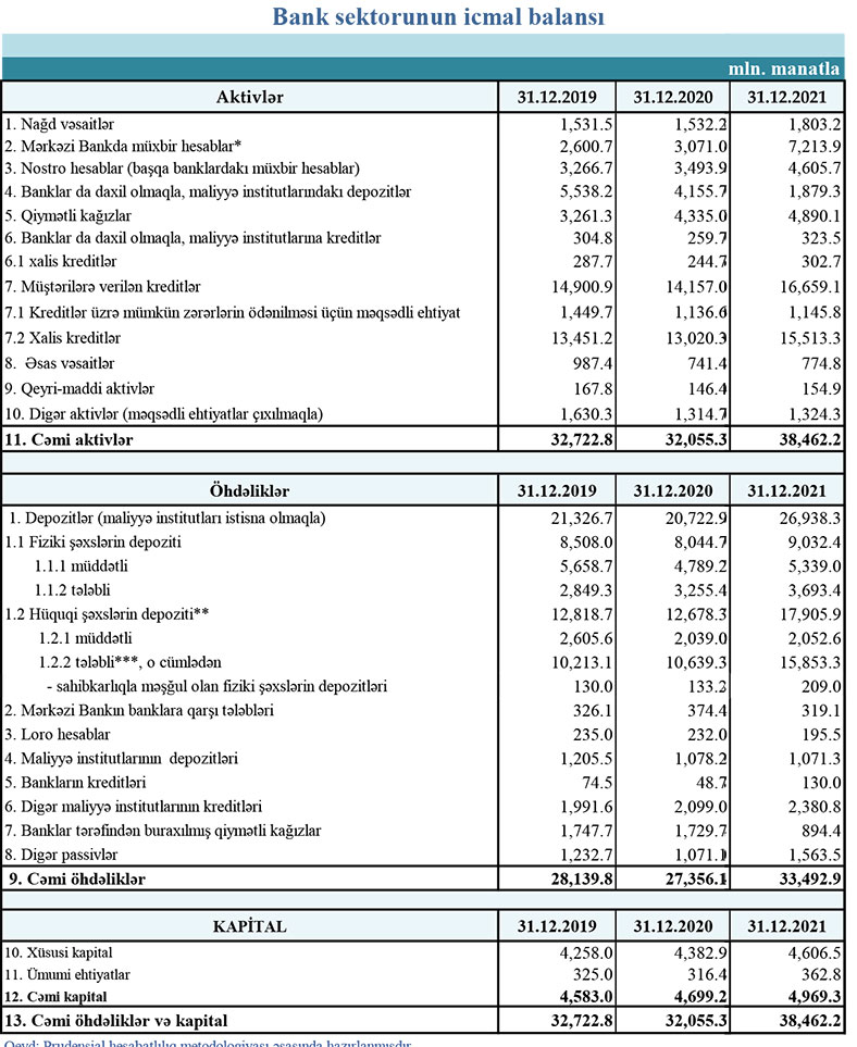 31 dekabr 2021-ci il tarixinə Azərbaycanda fəaliyyətdə olan kommersiya banklarının cəmi aktivləri 38 milyard 462,2 milyon manat, cəmi öhdəlikləri 33 milyard 492,9 milyon manat, balans kapitalı isə 4 milyard 969,3 milyon manat olub.