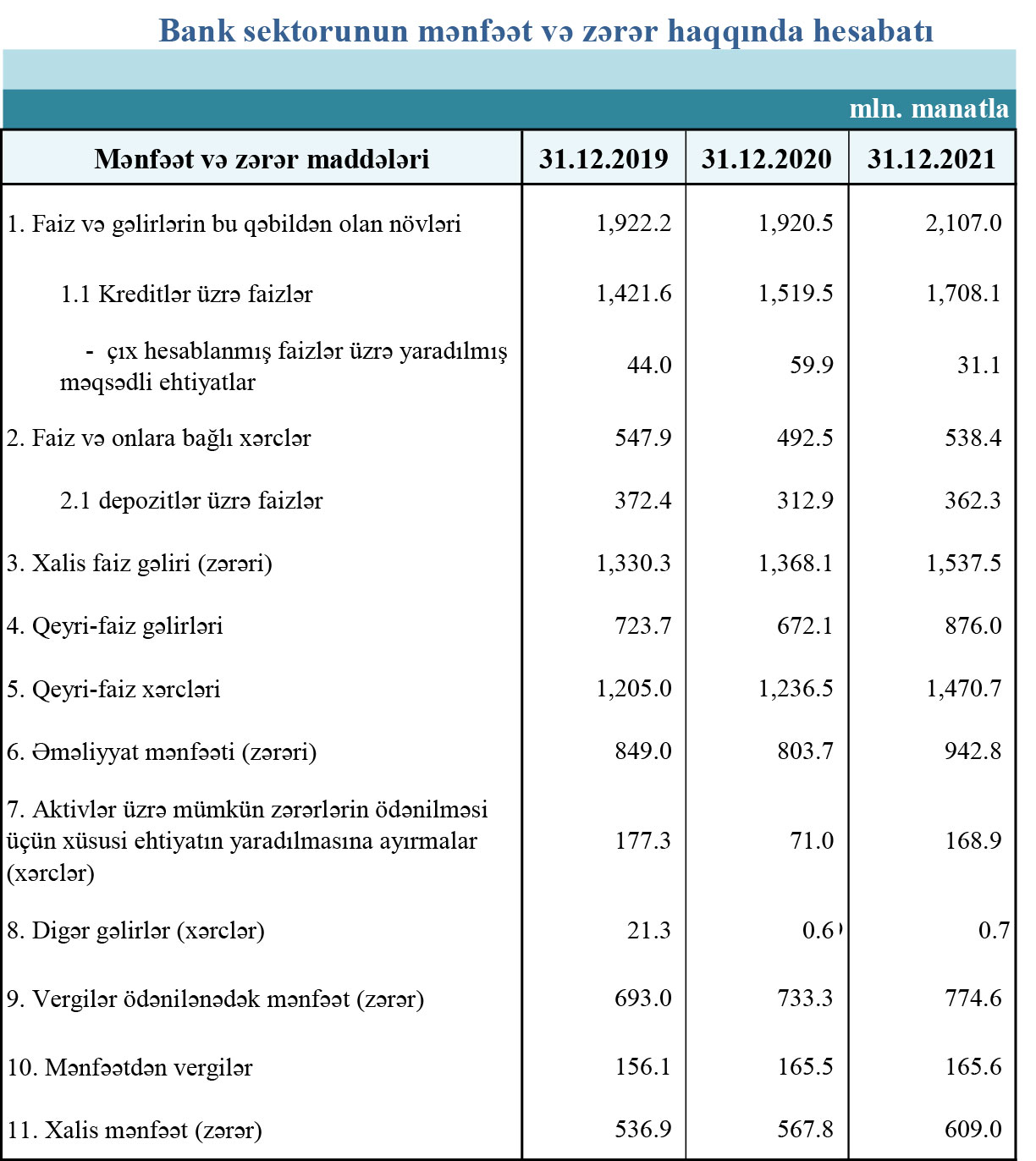 Azərbaycanın bank sektoru 2021-ci ili 609 milyon manat xalis mənfəət ilə başa vurub. 2020-ci illə müqayisədə ötən il bank sektorunun xalis mənfəəti 41,2 milyon manat və ya 7,2% artıb. Azərbaycanın bank sektoru 2020-ci ili 567,8 milyon manat xalis mənfəət ilə bağlamışdı.