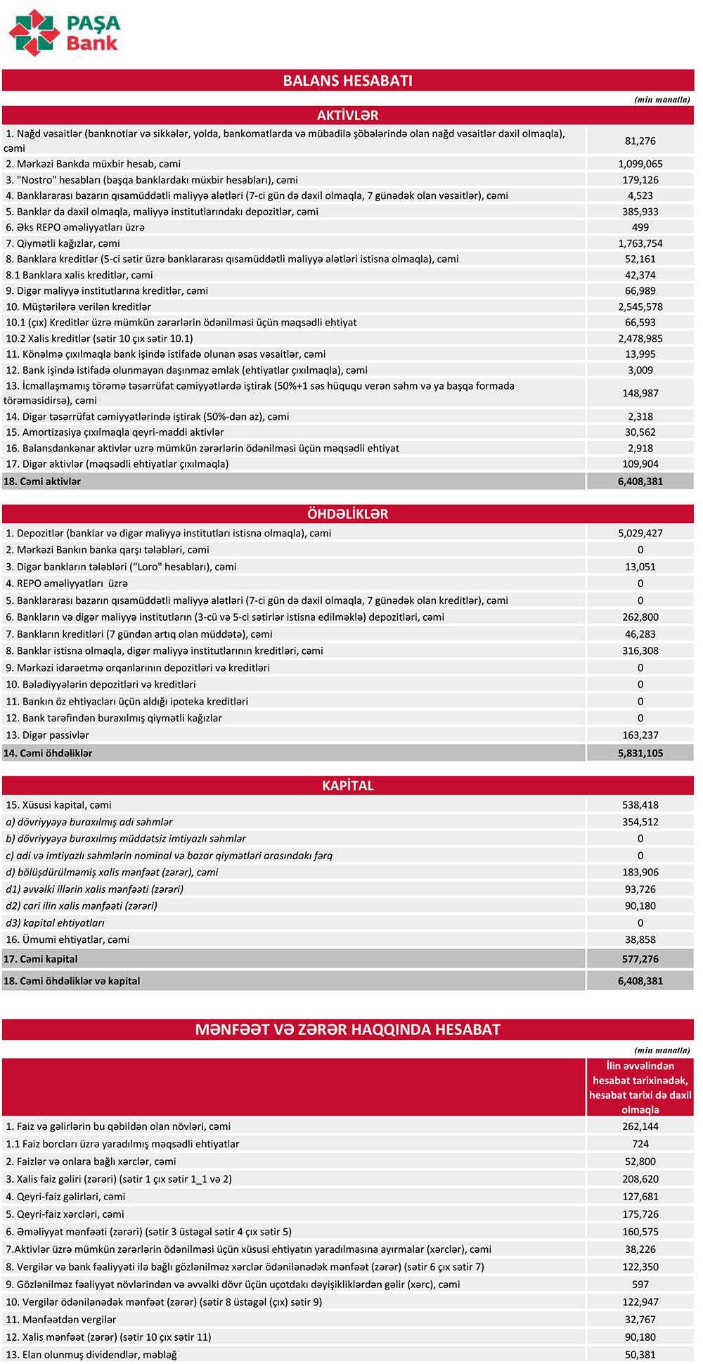Ötən il “PAŞA Bank”ın cəmi gəlirləri 390 milyon 422 min manat, cəmi xərcləri 300 milyon 242 min manat təşkil edib.
