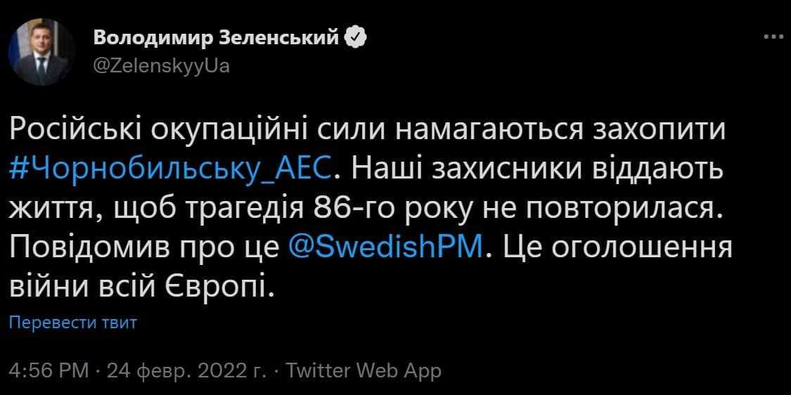 "Bu, bütün Avropaya müharibə elanıdır. Müdafiəçilərimiz 1986-cı il faciəsinin bir daha təkrarlanmaması üçün canlarını verirlər. Bu barədə İsveç Baş nazirinə məlumat vermişəm".