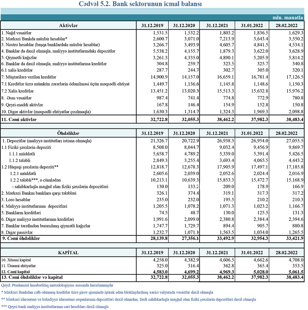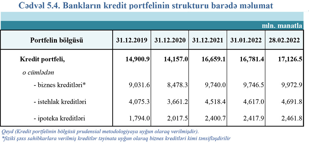 28 Fevral 2022-ci il tarixinə Azərbaycanın bank sektorunun cəmi kredit portfeli 17 milyard 126,5 milyon manat təşkil edib.
