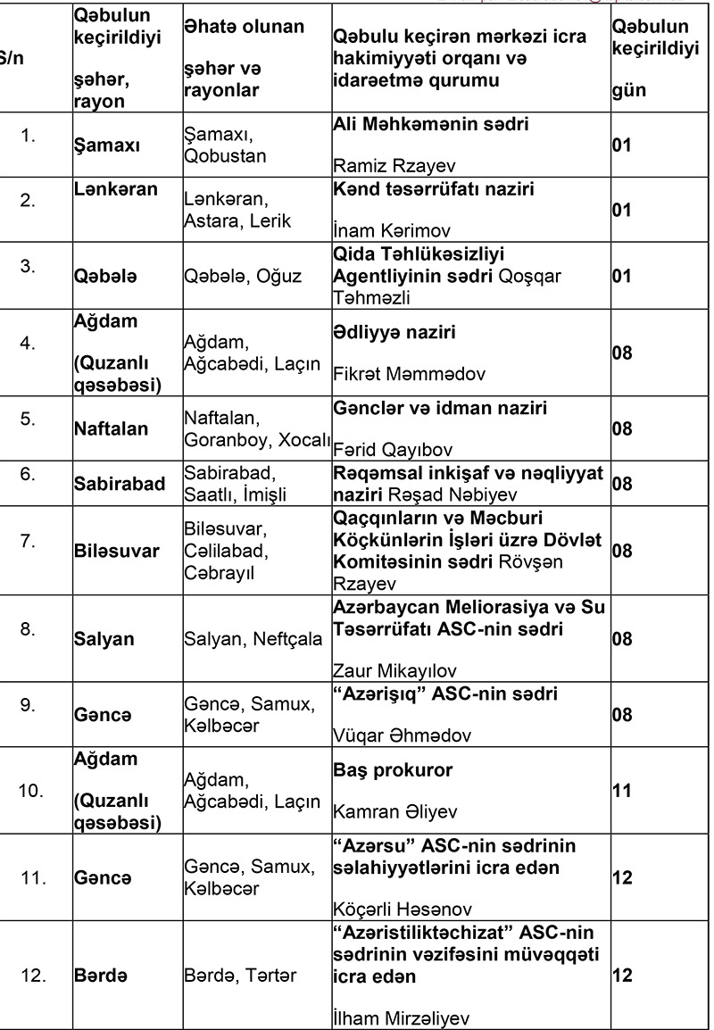Mərkəzi icra hakimiyyəti orqanlarının və digər idarəetmə qurumlarının rəhbərləri tərəfindən 2022-ci ilin aprel ayında şəhər və rayonlarda keçiriləcək vətəndaşların qəbulu cədvəli açıqlanıb.
