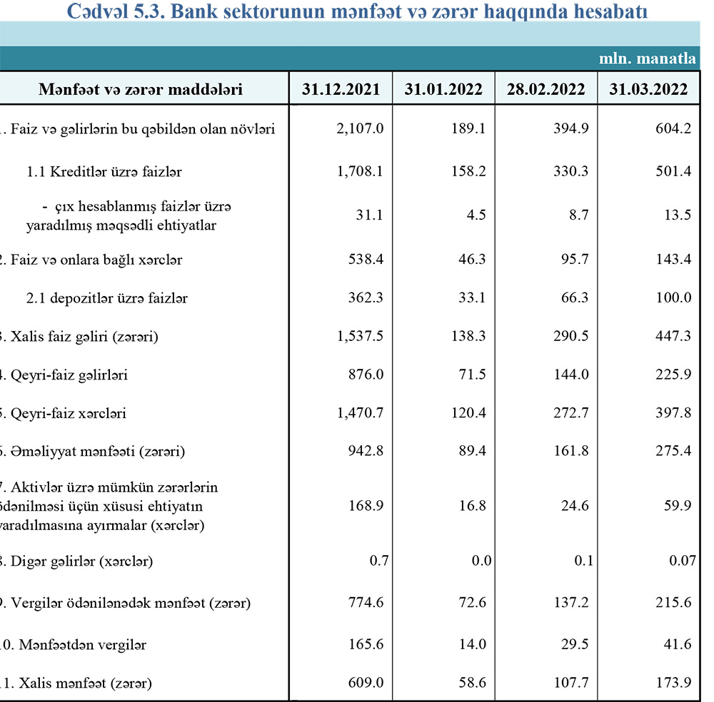 2021-ci ilin 1-ci rübündə bank sektorunun 495,3 milyon manat təşkil etmiş cəmi faiz gəlirləri, 2022-ci ilin 1-ci rübündə 604,2 milyon manat olub. Sektorun qeyri-faiz gəlirləri isə 170,8 milyon manatdan 225,9 milyon manata yüksəlib.