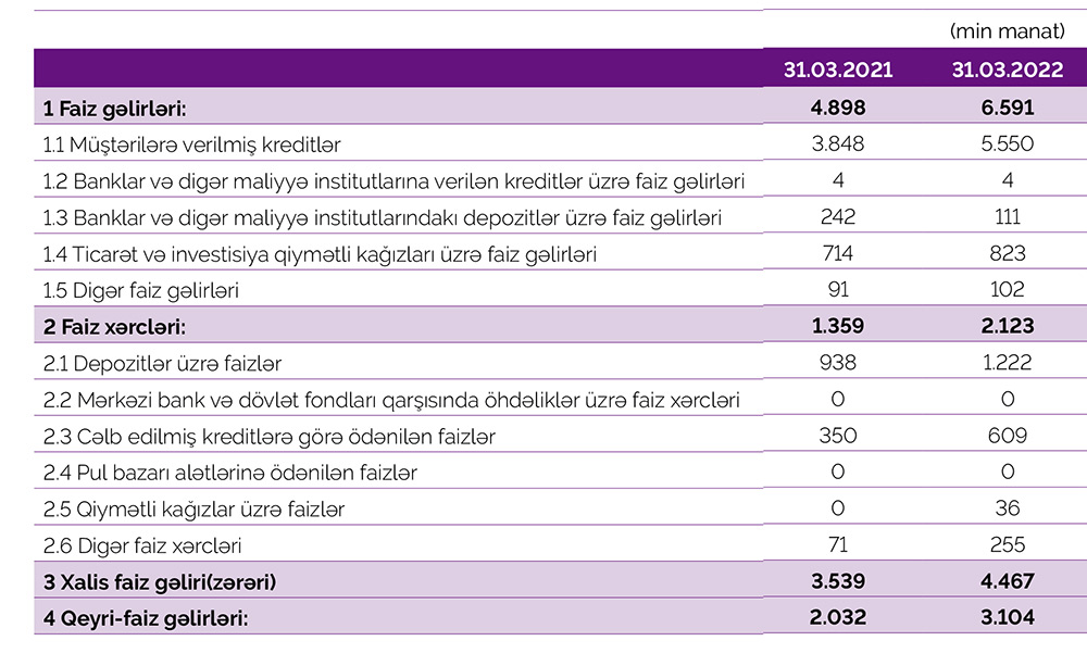 Marja.az xəbər verir ki, 2021-ci ilin yanvar-mart dövründə "Azər-Türk Bank"ın faiz gəlirləri 4 milyon 898 min manat ikən, 2022-ci ilin yanvar-mart dövründə 6 milyon 591 min manat təşkil edib (1 milyon 693 min manat və ya 34,5% artıb). Bankın qeyri-faiz gəlirləri isə 2 milyon 32 min manatdan 3 milyon 104 min manata yüksəlib (1 milyon 72 min manat və ya 52,7% artıb).
