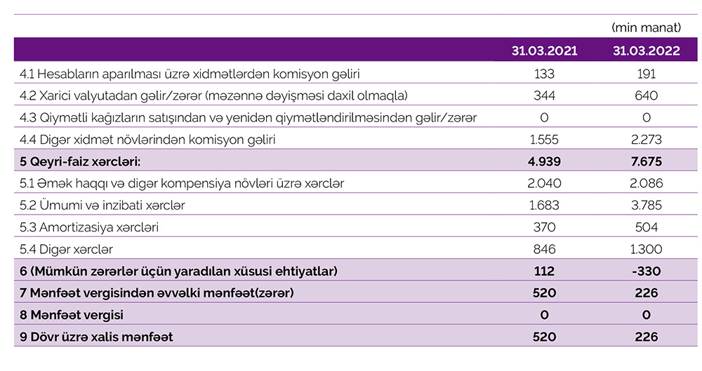 Müqayisə üçün qeyd edək ki, 2021-ci ilin yanvar-mart dövründə "Azər-Türk Bank"ın cəmi əməliyyat gəlirləri 6 milyon 930 min manat, əməliyyat xərcləri 6 milyon 298 min manat, gəlirlər xərcləri üstələdiyindən əməliyyat mənfəəti 632 min manat təşkil etmişdi. Bank əməliyyat mənfəətindən 112 min manat mümkün zərərlər üçün yaradılan xüsusi ehtiyatlara ayırmışdı. Nətcədə, "Azər-Türk Bank" ötən ilin ilk 3 ayını 520 min manat xalis mənfət ilə başa vurmuşdu.
