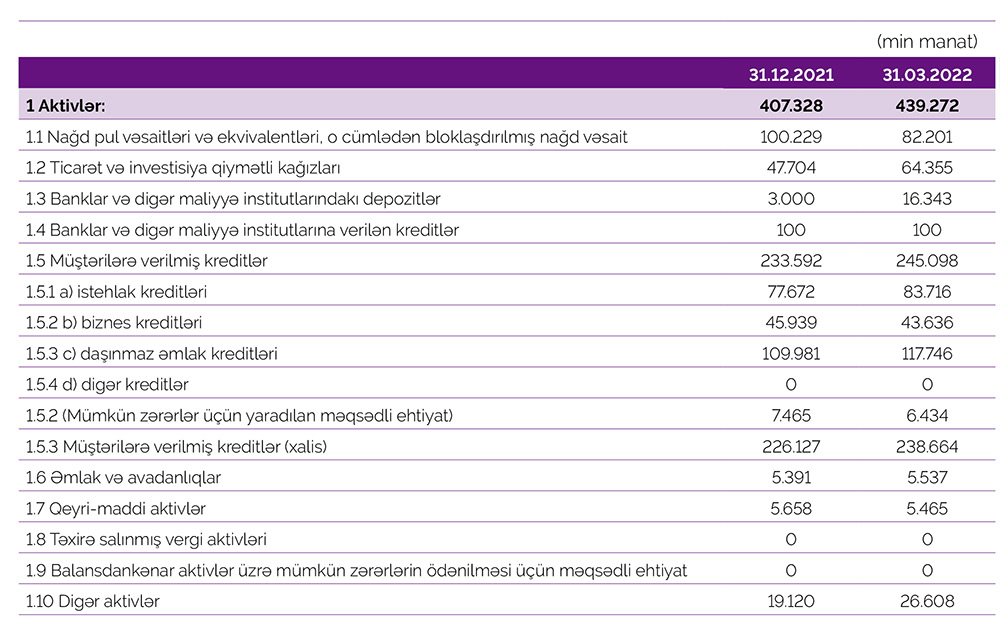 2021-ci ilin sonu ilə müqayisədə ilk rübdə "Azər-Türk Bank"ın cəmi aktivləri 31 milyon 944 min manat və ya 7,8% aratarq 31 mart 2022-ci il tarixində 439 milyon 272 min manata, o cümlədən, kredit portfeli (müştərilərə verilən kreditlər) 11 milyon 506 min manat və ya 4,9% artaraq 245 milyon 98 min manata çatıb.