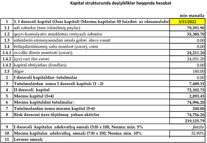 Bankın cari ilin ilk 3 ayında I dərəcəli kapitalının adekvatlıq əmsalı 33%, məcmu kapitalının adekvatlıq əmsalı 34%, leverec əmsalı 20%-ə bərabər olmuşdur. Nəticə etibarilə, bankın kapital adekvatlığı göstəriciləri tənzimləyici orqanın müəyyən etdiyi normalardan əhəmiyyətli dərəcədə yüksək olmuşdur. Qeyd edək ki, Mərkəzi Bankın tələblərinə görə məcmu kapitalın adekvatlılıq əmsalı minimum 10% olmalıdır.