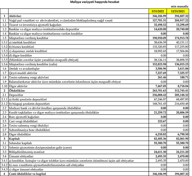 2022-ci ilin ilk rübünün nəticələrinə görə hazırda bankın məcmu kapitalı 75 milyon manat təşkil edir və mövcud qanunvericiliyə əsasən minimum məcmu kapital norması 50 milyon manatdır.