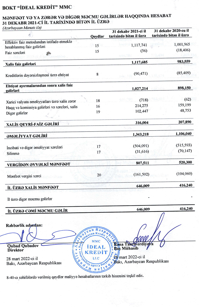 BOKT "İdeal Kredit" MMC 2021-ci ili 646 min manat xalis mənfəət ilə başa vurub. Halbuki, təşkilat 2020-ci ili 416 min manat xalis mənfəət ilə bağlamışdı. Beləliklə, 2020-ci illə müqayisədə 2021-ci ildə "İdeal Kredit"in xalis mənfəəti 55,2% artıb.
