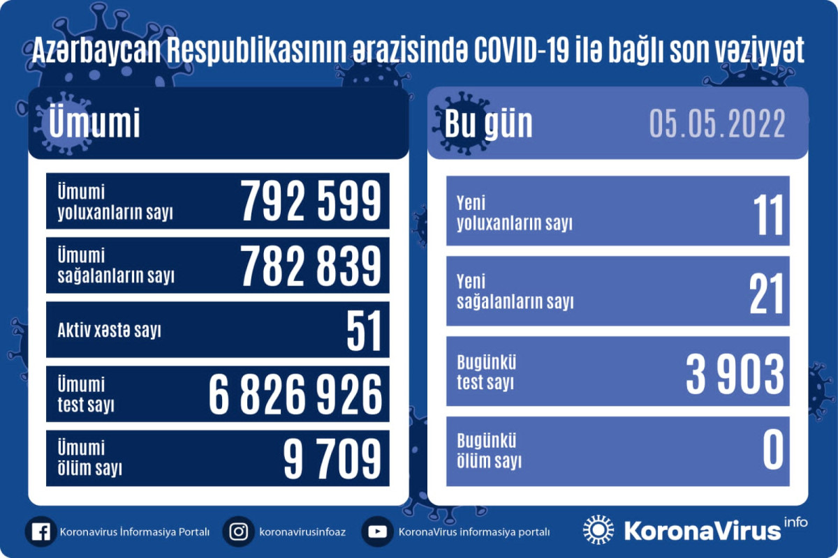 Azərbaycanda indiyədək ümumilikdə 792 599 nəfərin koronavirus infeksiyasına yoluxması faktı müəyyən edilib. Onlardan 782 839 nəfər müalicə olunaraq sağalıb, 9 709 nəfər vəfat edib, aktiv xəstə sayı 51 nəfərdir.