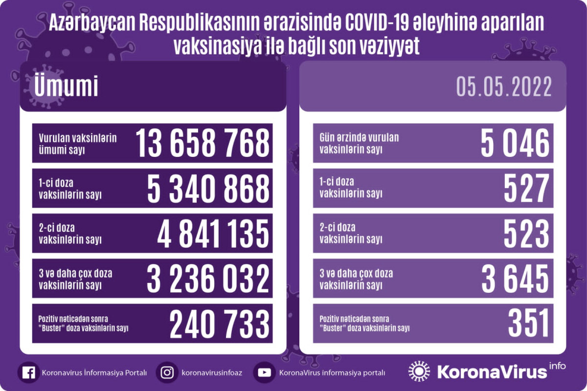 Vurulan vaksinlərin ümumi sayı 13 658 768, birinci mərhələ üzrə vaksinasiya olunanların ümumi sayı 5 340 868, ikinci mərhələ üzrə vaksinasiya olunanların sayı 4 841 135, üç və daha çox doza üzrə vaksinasiya olunanların sayı 3 236 032, pozitiv nəticədən sonra buster doza üzrə vaksinasiya olunanların sayı isə 240 733 nəfər təşkil edir.