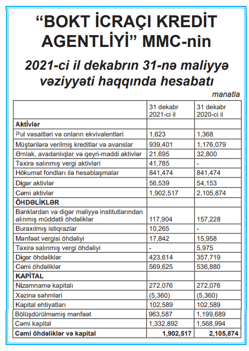 Balans hesabatından məlum olur ki, "BOKT İcraçı Kredit Agentliyi" bölüşdürülməmiş mənfəəti 2020-ci ilin sonunda 1 milyon 200 min manat ikən, 2021-ci ilin sonunda 964 min manat təşkil edib (20% azalıb).