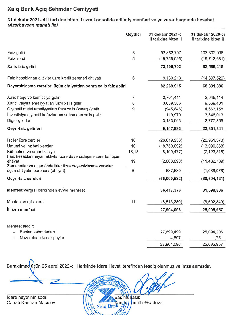 "Xalq Bank"ın faiz gəlirləri 2020-ci ildə 103 milyon 302 min manat ikən, 2021-ci ildə 92 milyon 863 min manat təşkil edib. Bankın qeyri-faiz gəlirləri isə 2020-ci ildə 23 milyon 301 min manat ikən, 2021-ci ildə 9 milyon 148 min manat olub. Gəlirlərin azalması ilə bərabər, ehtiyatdan azad olmuş 9 milyon 163 min manat azad olub. Eyni zamanda Bankın qeyri-faiz xərcləri azalıb. Ehtiyatdan azad olmuş məbləğin və qeyri-faiz xərclərinin azalması hesabına Xalq Bankın xalis mənfətində artım qeydə alınıb.