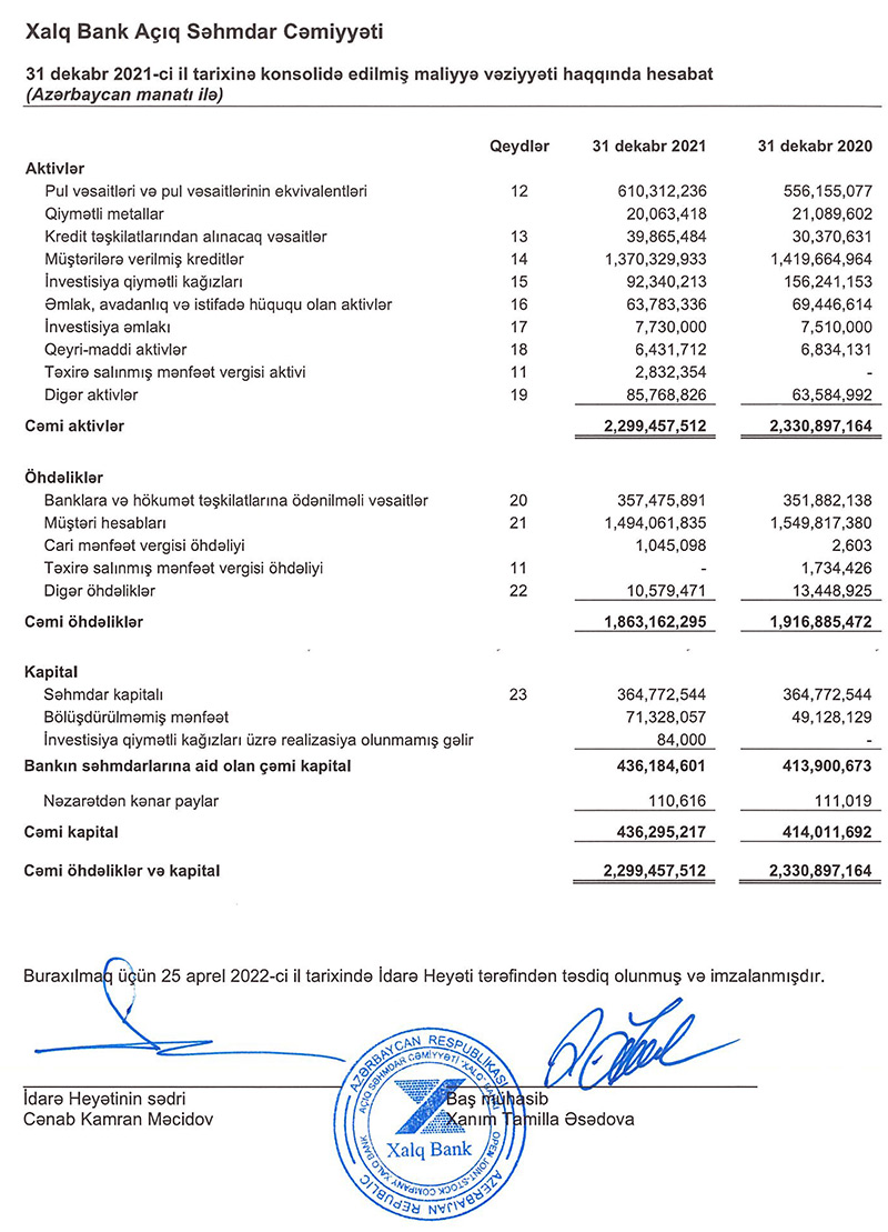 "Xalq Bank" ASC 2021-ci il üzrə konsolidə edilmiş maliyyə hesabatlarını və auditor rəyini dərc edib.