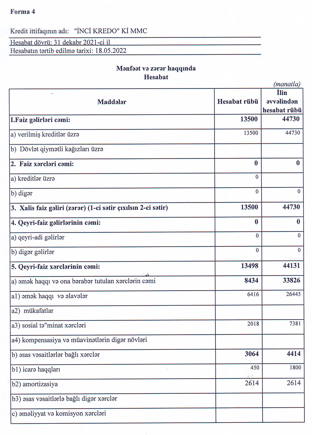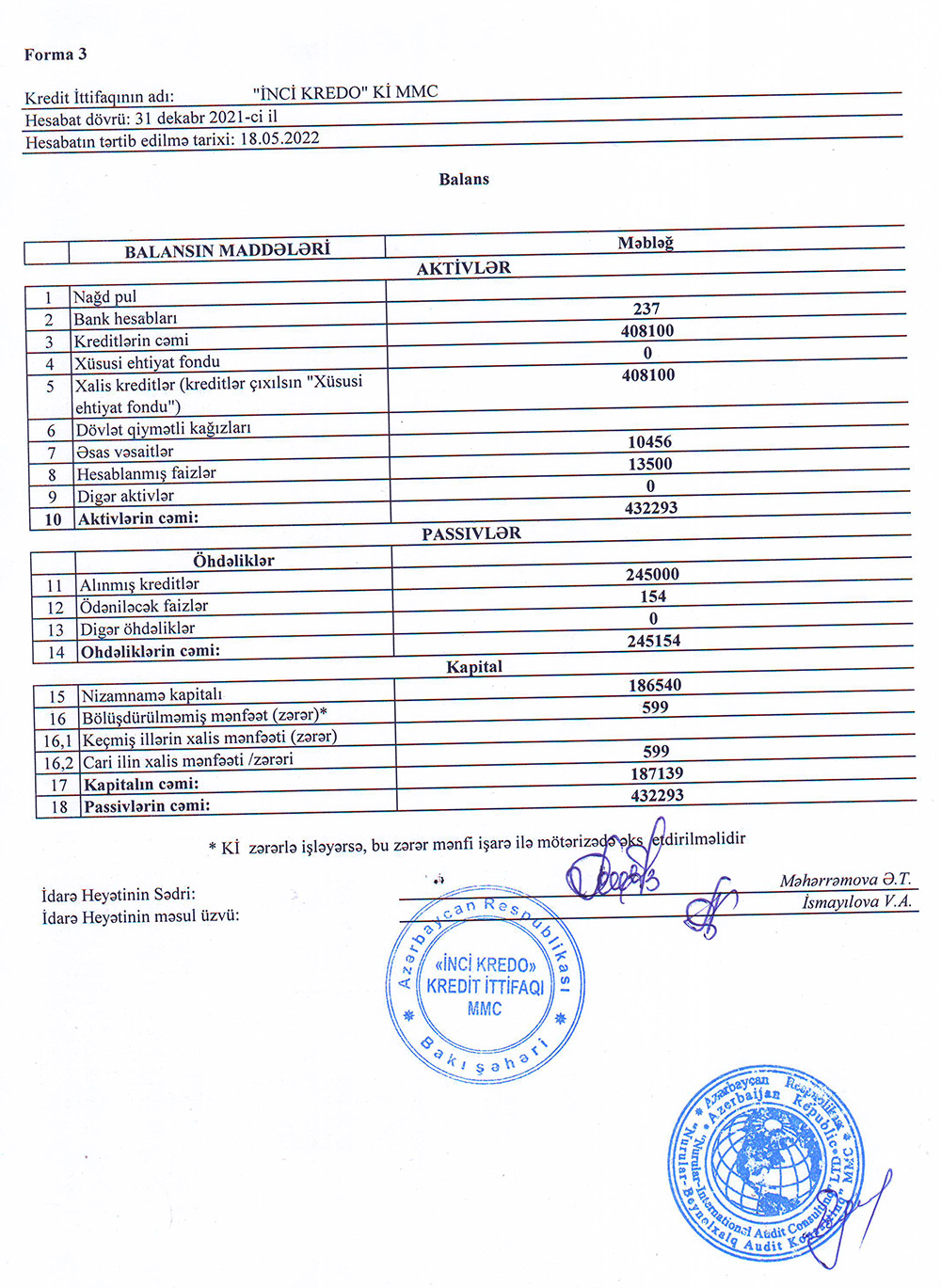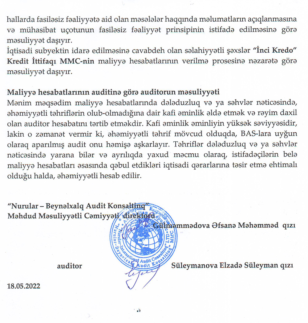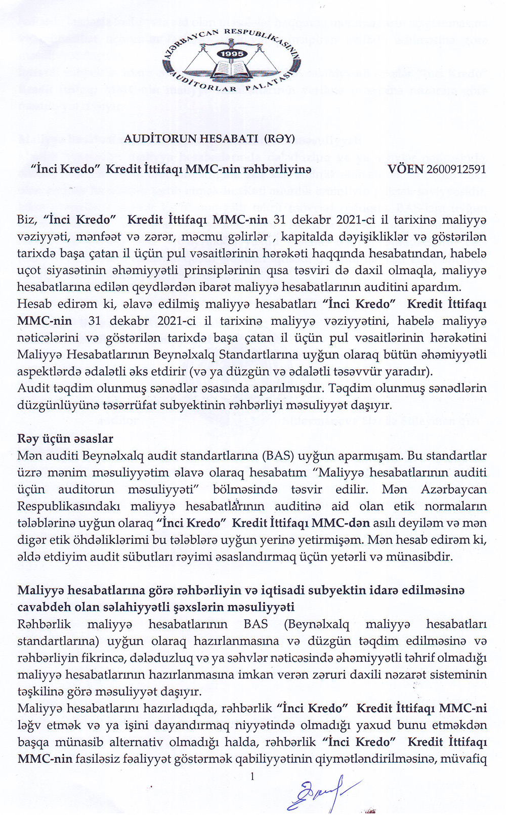 "İnci Kredo Kredit İttifaqı" MMC-nin 31 Dekabr 2021-ci il tarixində bitən il üzrə maliyyə hesabatları.