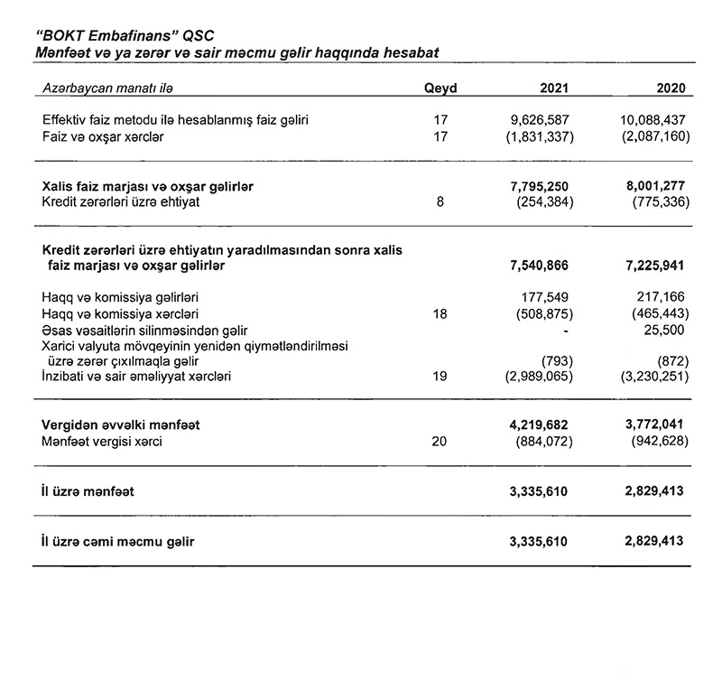 “BOKT Embafinans” QSC 2021-ci ili 3 milyon 335 min 610 manat xalis mənfəət ilə başa vurub. QSC 2020-ci ili 2 milyon 829 min 413 manat xalis mənfəət ilə bağlamışdı. Beləliklə, 2020-ci illə müqayisədə 2021-ci ildə “BOKT Embafinans”ın xalis mənfəəti 506 min 197 manat və ya 17,9% artıb.