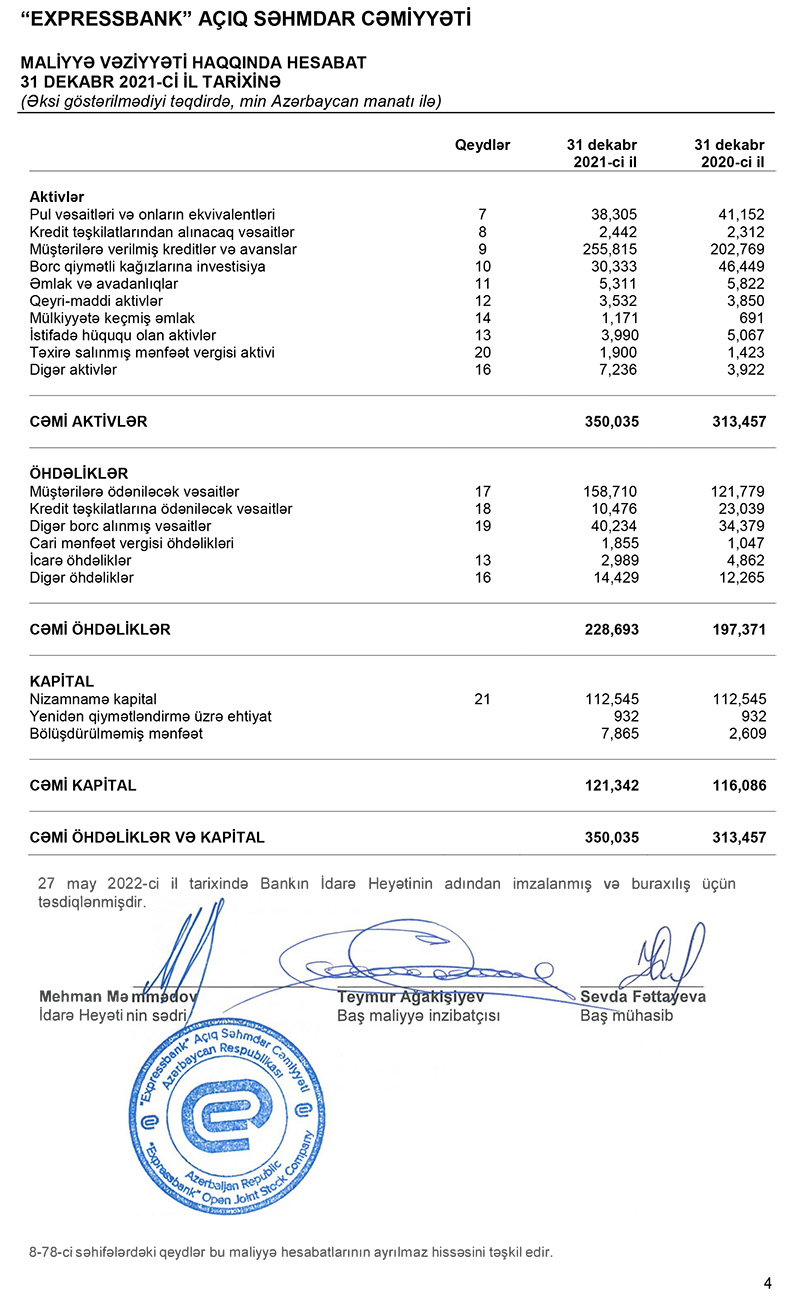 2021-ci ildə “Expressbank”ın cəmi aktivləri 350 milyon 35 min manat olub ki, bu da əvvəlki ilə nisbətən 12% artımdır. Bunun 255 milyon 815 min manatı müştərilərə verilmiş kreditlərdir. Belə ki, bankın kredit portfeli 26.2% böyüyüb.