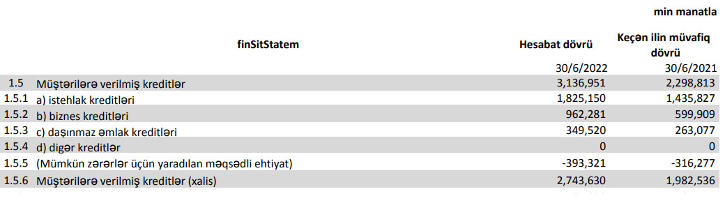 Müştərilərə verilmiş xalis kreditlər (mümkün zərərlər üçün yaradılan məqsədli ehtiyat xaric kreditlər) 761 milyon 94 min manat artaraq 2 milyard 743 milyon 630 min manata çatıb.