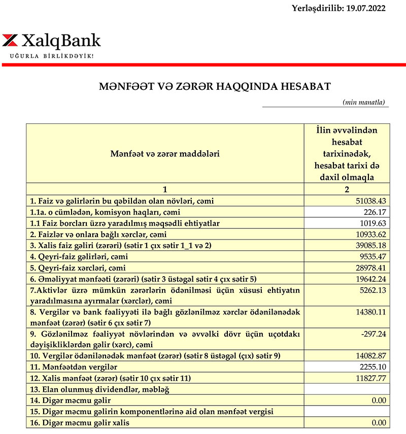 Azərbaycanın ən böyük banklarından biri olan "Xalq Bank" 2022-ci ilin birinci yarısını (yanvar-iyun dövrünü) 11 milyon 828 min manat xalis mənfəət ilə başa vurub. Bank ötən ilin eyni dövrünü 5 milyon 819 min manat xalis mənfəət ilə bağlamışdı. Beləliklə, 2021-ci ilin 1-ci yarısı ilə müqayisədə 2022-ci ilin 1-ci yarısında "Xalq Bank"ın xalis mənfəəti 2 dəfə artıb. Xalis mənfəətin artması gəlirlərin artması və aktivlər üzrə mümkün zərərlərin ödənilməsi üçün xüsusi ehtiyatın yaradılmasına ayırmanın azalması ilə əlaqədardır.