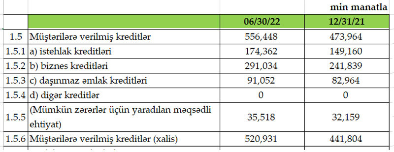 2022-ci ilin yanvar-iyun dövründə "Rabitəbank" ASC tərəfindən müştərilərə verilmiş kreditlər 82 milyon 485 min manat və ya 17,4% artaraq 30 iyun 2022-ci il tarixində 556 milyon 448 min manat təşkil edib.