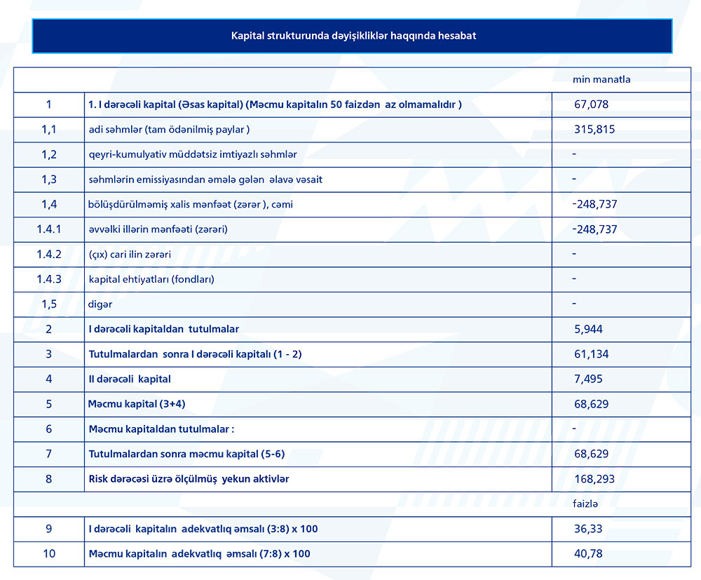 Bankın kapitalı hesabat dövrünün sonuna 74.6 milyon manat təşkil edib, bu da Mərkəzi Bankın tələblərindən 49.2% çoxdur. Bankın likvidlik göstəricisi birinci yarımilin sonuna 72.1% təşkil edib. Bu normativ tələblərdən 2.4 çoxdur.