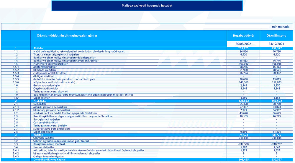 Bankın kredit portfeli birinci yarımilin sonunda 167 milyon manat təşkil edib. Bu ötən ilin müvafiq dövrünün gostəricisindən 5% çoxdur. Fiziki şəxslərin əmanətləri bir il ərzində 40% artaraq, iyun ayının sonuna 57.4 milyon manat təşkil edib.