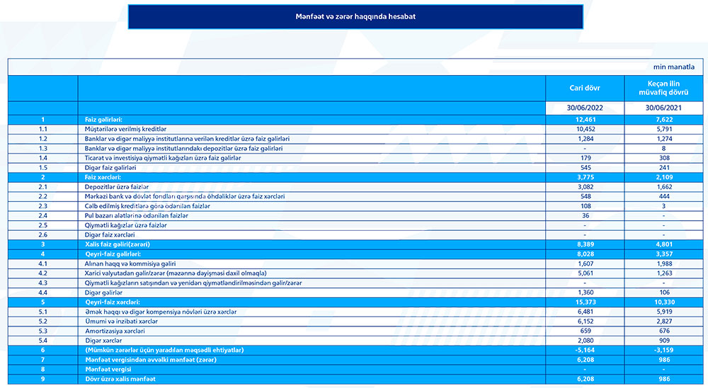 Bankın yaydığı press-relizdə bildirilir ki, 30 iyun 2022-ci il tarixinə bankın əməliyyat gəlirləri 20.5 milyon manat, o cümlədən faiz gəlirləri 12.5 milyon manat, qeyri-faiz gəlirləri – 8 milyon manat təşkil edib. Ötən ilin müvafiq dövrü ilə müqayisədə bankın faiz gəlirləri 63.5%, qeyri-faiz gəlirləri isə 2.4 dəfə artıb.