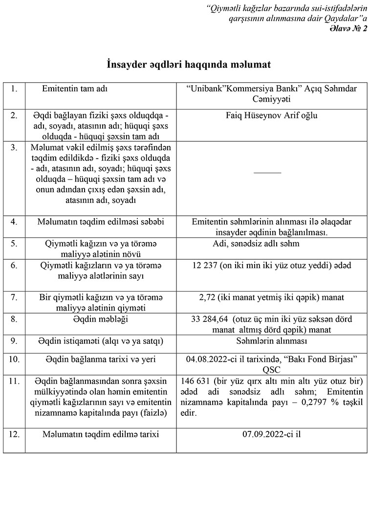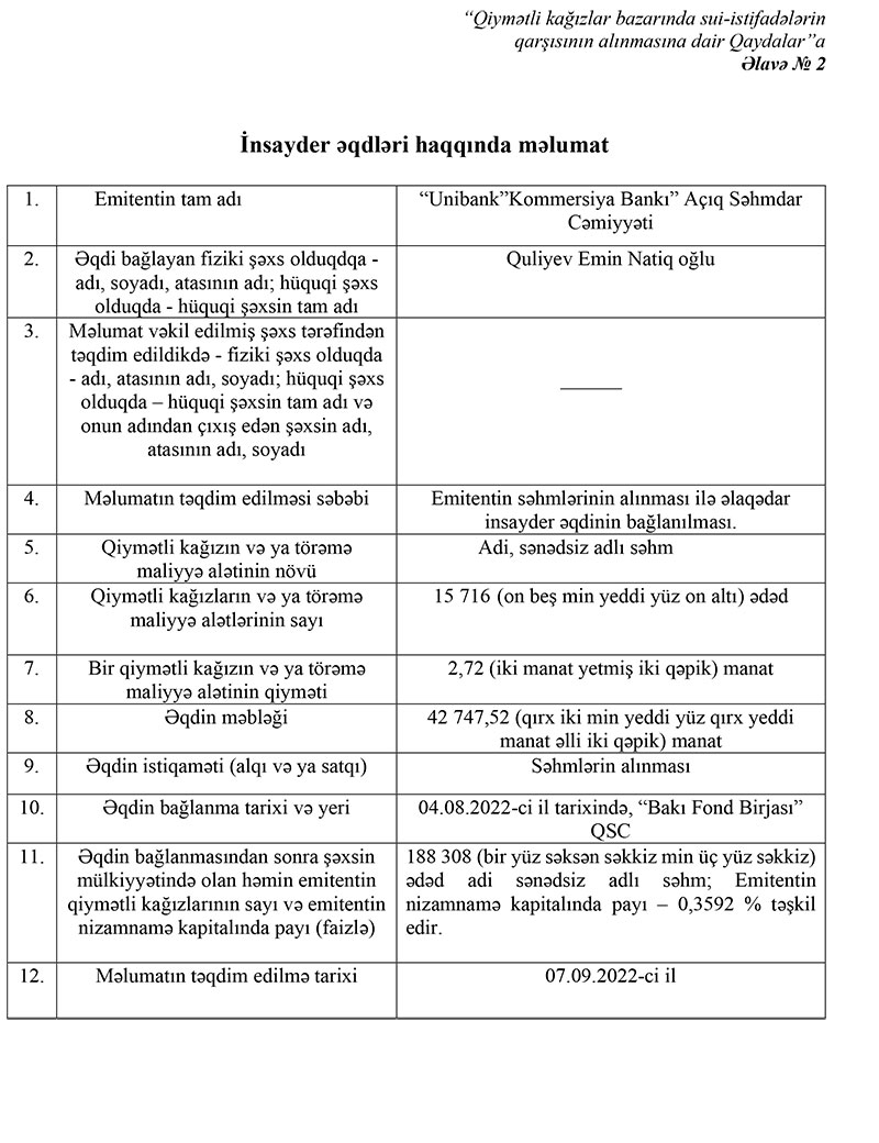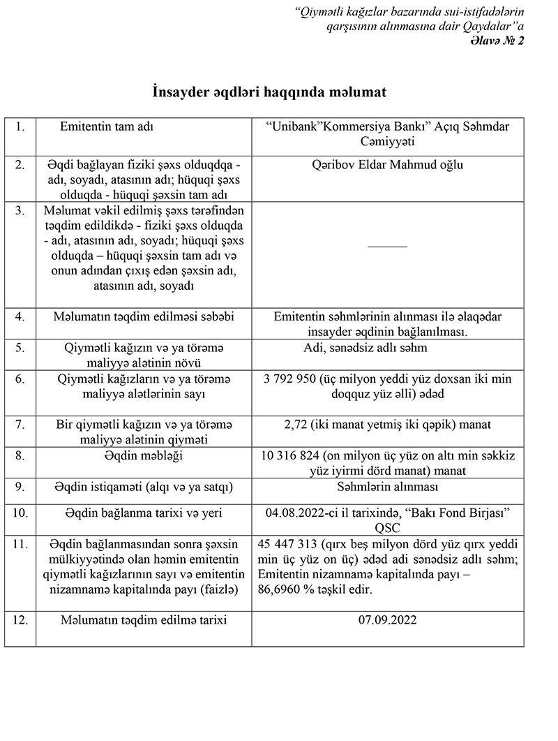 Unibankın yeni emissiya etdiyi hər birinin nominal dəyəri 2,72 manat olan 4 milyon 375 min ədəd adi, adlı, sənədsiz 16 milyon 275 min manatlıq səhmlərinin 10 milyon 316 min 824 manatlıq hissəsi (3 792 950 ədəd səhm) Qəribov Eldar Mahmud oğlu, 33 min 284,64 manatlıq hissəsi (12 min 237 ədəd səhm) Hüseynov Faiq Arif oğlu, 42 min 747,52 manatlıq hissəsi (15 min 716 ədəd səhm) Quliyev Emin Natiq oğlu tərəfindən alınıb.