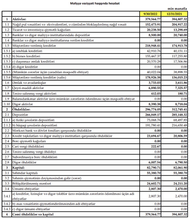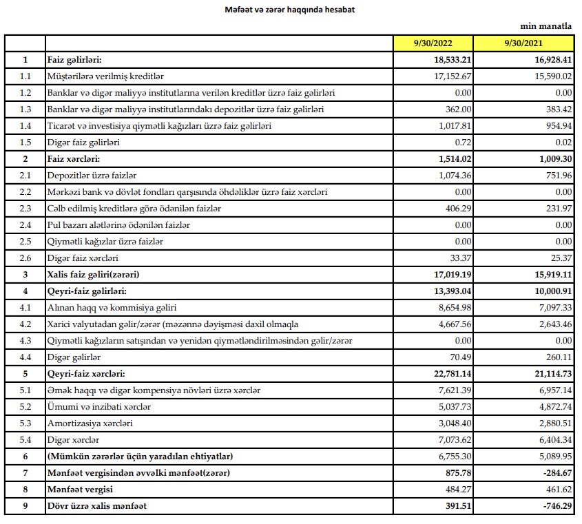 Müqayisə üçün qeyd edək ki, 2021-ci ilin 9 ayında “Yapı Kredi Bank Azərbaycan”ın cəmi əməliyyat gəlirləri 26 milyon 928 min manat, cəmi əməliyyat xərcləri 22 milyon 123 min manat, əməliyyat mənfəəti 4 milyon 805 min manat təşkil etmişdi. Bank əməliyyat mənfəətindən 5 milyon 89 min manat mümkün zərərlər üçün yaradılan ehtiyatlara ayırmışdı və 463 min manat mənfəət vergisi ödəmişdi.