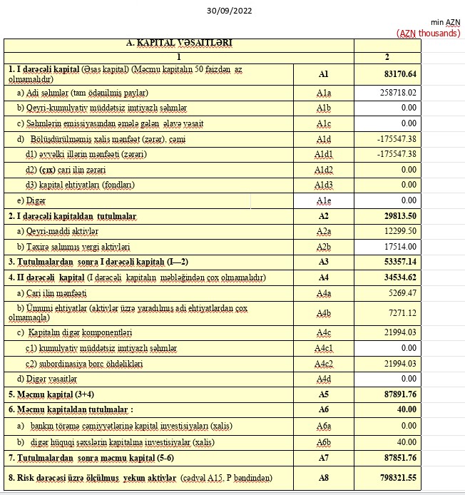 - Bankın məcmu kapitalı son 1 il ərzində 13.3% və ya 10.3 milyon manata artaraq 87.9 milyon manata çatıb. Bu da AMB-ın tələb etdiyi minimum normadan 37.9 milyon manat artıqdır.