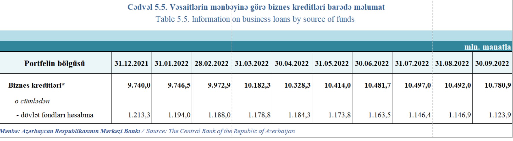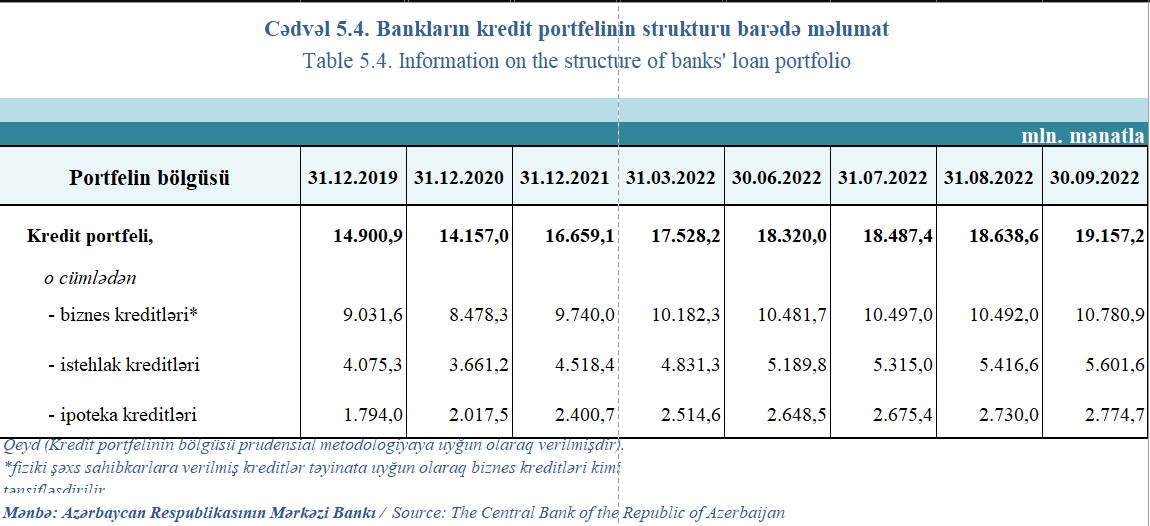 O cümlədən, 2022-ci ilin avqust ayı ilə müqayisədə sentyabr ayında biznes kreditləri portfeli 288,9 milyon manat artaraq 10 milyard 780,9 milyon manata, istehlak kreditləri portfeli 185 milyon manat artaraq 5 milyard 601,6 milyon manata, ipoteka kreditləri portfeli isə 44,7 milyon manat artaraq 2 milyard 774,7 milyon manata yüksəlib.