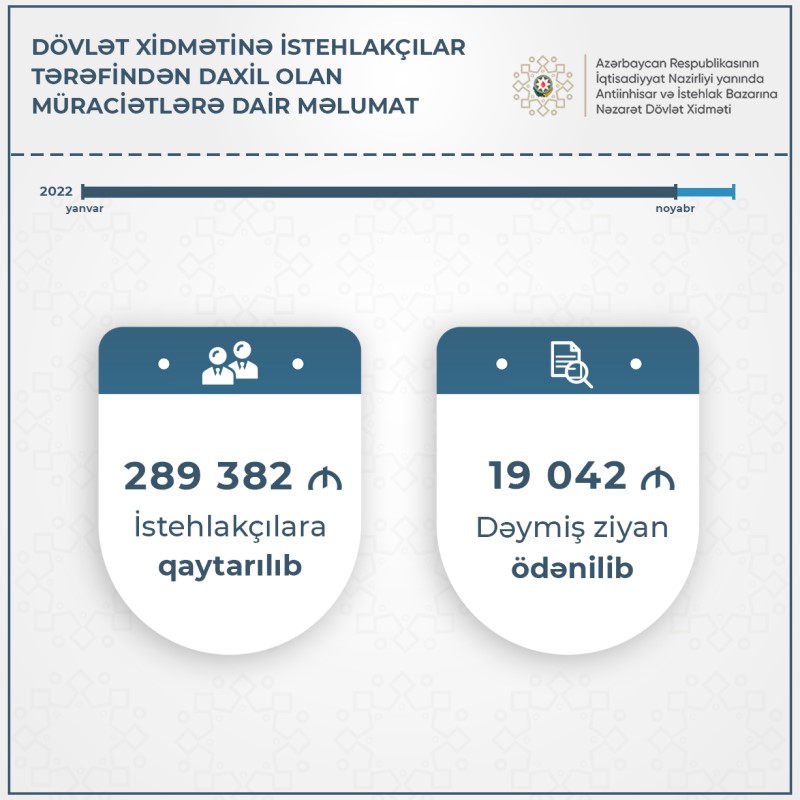 2022-ci ilin yanvar-noyabr aylarında Antiinhisar və İstehlak Bazarına Nəzarət Dövlət Xidmətində istehlakçılar tərəfindən daxil olan 5021 müraciətə baxılıb və 2042-si təmin olunub.
