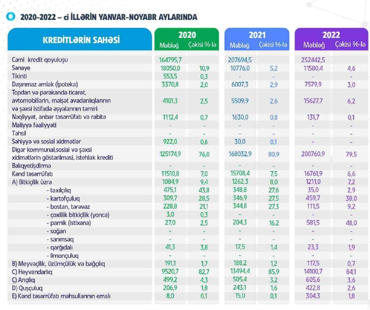 30 Noyabr 2022-ci il tarixində Naxçıvanda cəmi kredit qoyuluşu 252 milyon 442,5 min manat təşkil edib. O cümlədən, kreditlərin 200 milyon 760,9 min manatı istehlak kreditləri olub.