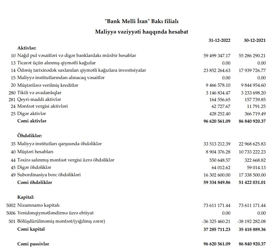 "Bank Melli İran" Bakı filialı 2022-ci ili 1 milyon 867 min manat xalis mənfəət ilə başa vurub. Halbuki, filial 2021-ci ili 1 milyon 960 min manat xalis zərər ilə bağlamışdı. Ötən ilin xalis mənfəəti, əsasən ehtimal olunan zərərlər üzrə yaradılmış ehtiyatdan azad olmuş vəsait, faiz xərclərinin azalması və xarici valyuta əməliyyatları üzrə gəlirlərin artması ilə əlaqədardır.