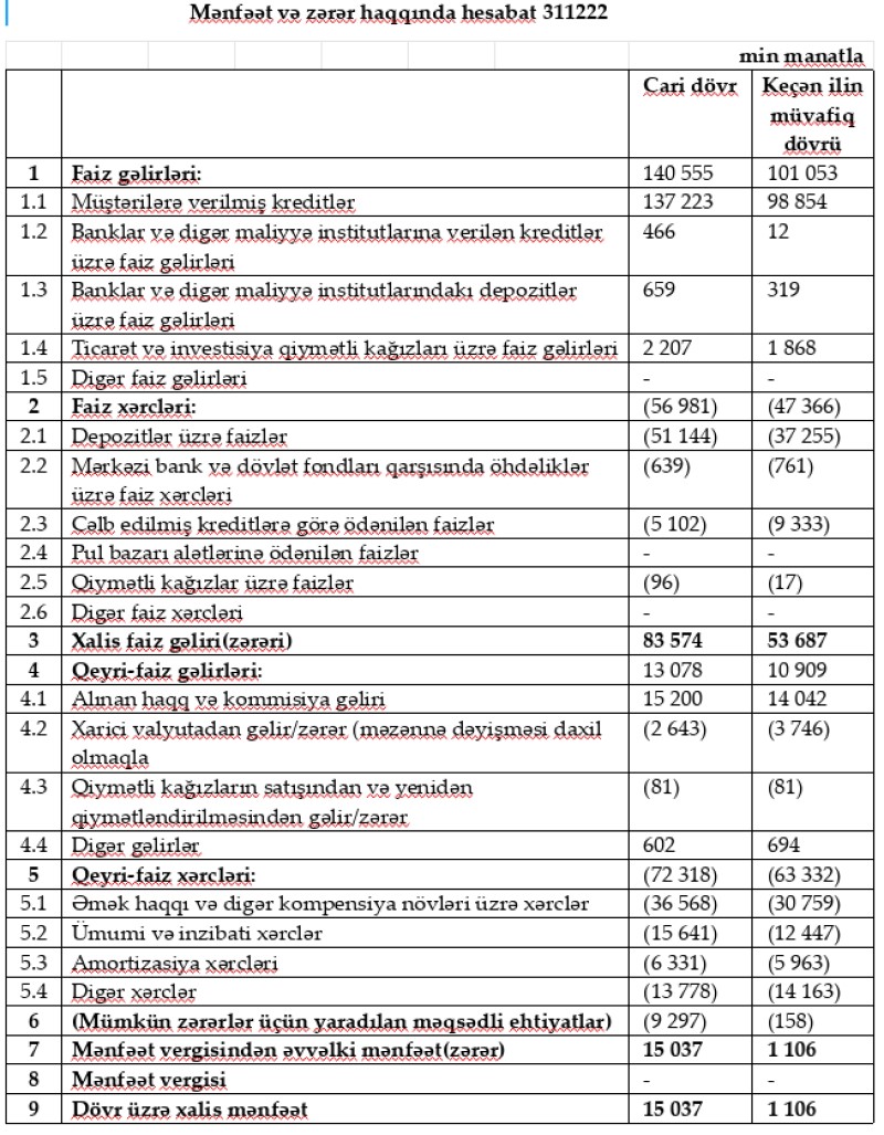 -Bankın 2022-ci il üzrə yekun xalis mənfəəti də 2021-ci ilin nəticəsi ilə müqayisədə dəfələrlə artaraq 15 milyon manata çatıb. 4-cü rüb ərzində bankın xalis mənfəəti cari ilin 3-ci rübü ilə müqayisədə 3 dəfəyə qədər artıb.