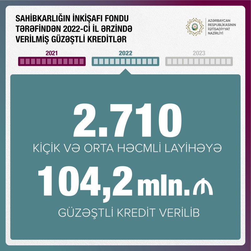 Sahibkarlığın İnkişafı Fondu tərəfindən 2022-ci il ərzində 2710 kiçik və orta həcmli layihəyə 104,2 milyon manat güzəştli kredit verilib.