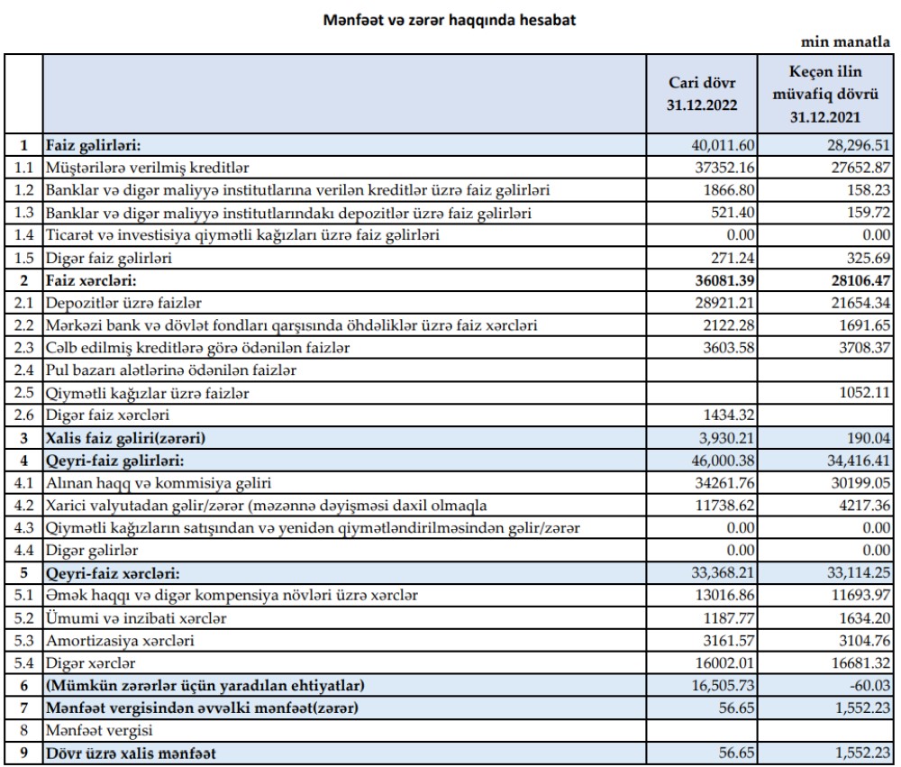 Müqayisə üçün qeyd edək ki, 2021-ci ildə Muğanbank"ın cəmi əməliyyat gəlirləri 62 milyon 712 min manat, cəmi əməliyyat xərcləri 61 milyon 220 min manat, əməliyyat mənfəəti 1 miylon 492 min manat təşkil etmişdi. Mümkün zərərlər üçün yaradılan ehtiyatlardan azad olmuş 60 min manatın hesabına mənfəət 1 milyon 552 min manata yüksəlmişdi.