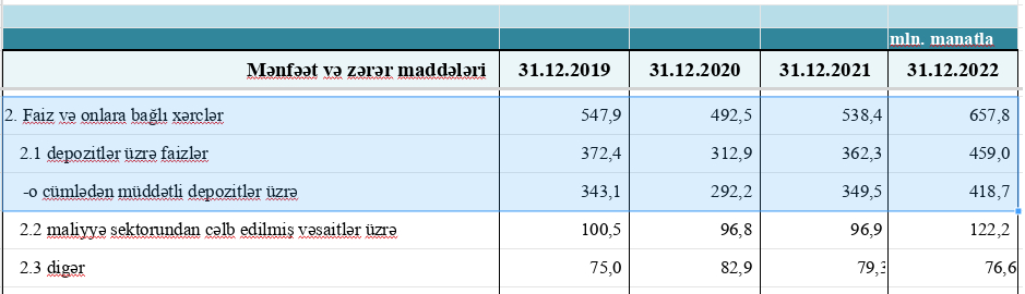 O cümlədən, 2022-ci ildə banklar müddətli depozitlər (əmanətlər) üzrə 418,7 milyon manat məbləğində faizlər ödəyiblər ki, bu da 2021-ci illə müqayisədə 69,2 milyon manat və ya 19,8% çoxdur. 2021-ci ildə banklar müddətli depozitlər üzrə 349,5 milyon manat məbləğində faizlər ödəmişdilər.