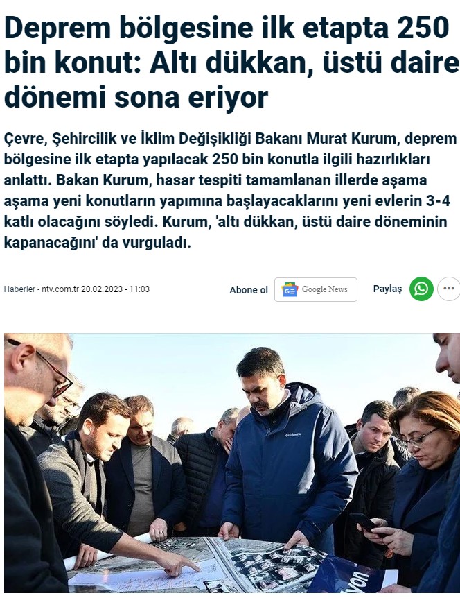 "Prezidentimizin rəhbərliyi ilə 11 vilayətdə Cümhuriyyət tarixinin ən böyük fəlakətli mənzil tikintisi səfərbərliyini həyata keçirəcəyik və vətəndaşlarımıza təhlükəsiz evlərin açarlarını verəcəyik. Martın əvvəlində 30 min evin tikintisinə başlayacağımızı bildirmişik. İnşallah bu rəqəmi daha da artıracağıq. Binalar 3-4 mərtəbəni keçməyəcək", - Murat Kurum deyib.