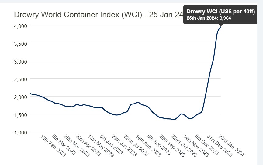 Qırmızı dənizdəki geosiyasi gərginlik səbəbindən yükdaşıma qiymətləri 8 həftədir artmaqdadır. Drewry-nin World Container Index-də verilən məlumata görə, 40-lıq konteyner üçün qiymət noyabrın 30-da 1382 dollar səviyyəsində ikən, yanvarın 25-də isə 3964 dollara çatıb. Drewry's World Container Index bu həftə 5% artıb.Qırmızı dənizdə gərginlik yükdaşıma qiymətlərini artırıb.