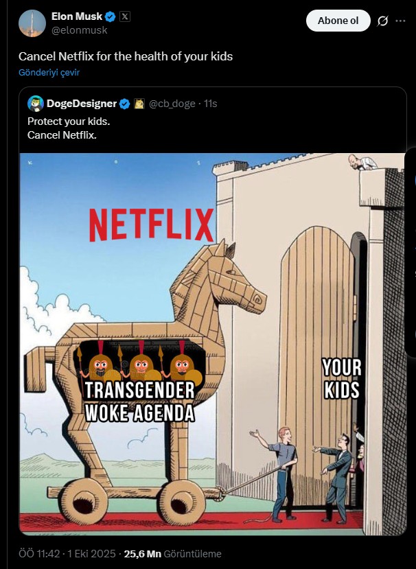 Musk öz sosial media platforması X-də yazıb: “Uşaqlarınızın sağlamlığı üçün Netflix-i ləğv edin.” O, bu paylaşımı - şirkətin transgender mövzusunu təbliğ etdiyini iddia edən bir post-a cavab olaraq edib. Tesla-nın İcraçı direktoru olan İlon Mask 226 milyon izləyicisi ilə bir sıra paylaşımları da artıraraq Netflix abunəliyinin azalması trendinin artdığını vurğulayıb. 226 milyon izləyicisi olan Mask, həmçinin Netflix abunəliyinin ləğv edilməsində artan tendensiyanı iddia edən bir neçə paylaşıma da diqqət çəkib.