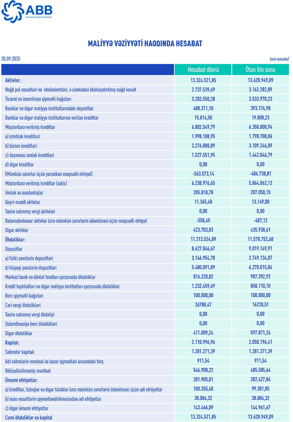 30 sentyabr 2025-ci il tarixində ABB 13 milyard 324 milyon 522 min manat cəmi aktivlərə malik olub. Bank 2024-cü ilin sonunda 13 milyard 628 milyon 949 min manat cəmi aktivlərə malik idi. Bankın qiymətli kağızlara investisiyalarının və nağd vəsaitlərin azalması aktivlərin cüzi düşməsinə səbəb olub.