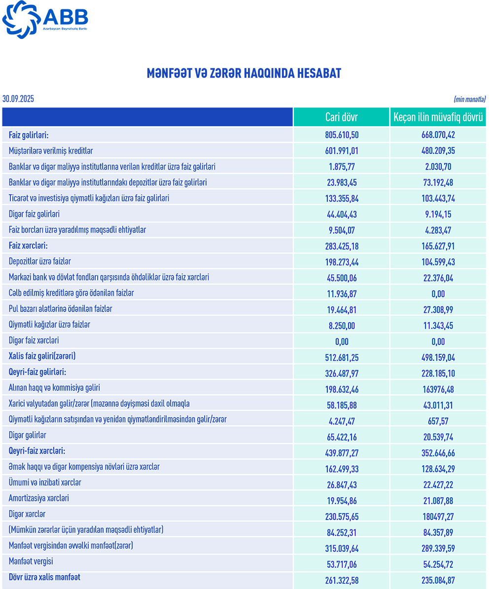 Aktivlərinin həcminə görə Azərbaycanın ən böyük bankı olan ABB (“Azərbaycan Beynəlxalq Bankı” ASC) 2025-cü ilin 9 ayını (yanvar-sentyabr) 261 milyon 323 min manat xalis mənfəətlə başa vurub. Bank ötən ilin eyni dövrünü 235 milyon 85 min manat xalis mənfəətlə bağlamışdı. Beləliklə, ABB-nin xalis mənfəəti 2025-cü ilin 9 ayında ötən ilin eyni dövrü ilə müqayisədə 26 milyon 238 min manat və ya 11,2% artıb.