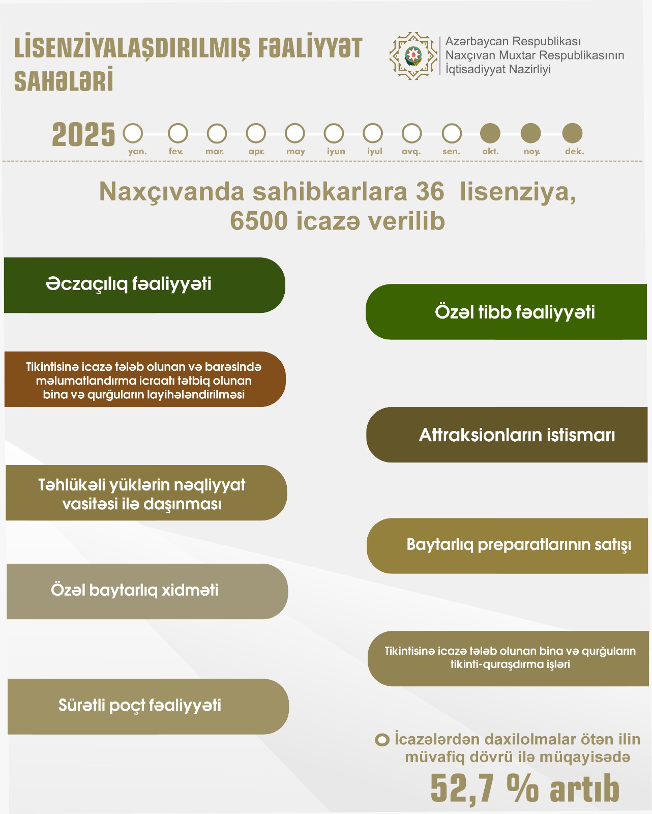 Naxçıvan Muxtar Respublikası İqtisadiyyat Nazirliyindən verilən məlumata görə,verilmiş lisenziyalar əczaçılıq, özəl tibb, tikintisinə icazə tələb olunan və barəsində məlumatlandırma icraatı tətbiq olunan bina və qurğuların layihələndirilməsi, attraksionların istismarı, təhlükəli yüklərin nəqliyyat vasitəsilə daşınması, baytarlıq preparatlarının satışı, özəl baytarlıq xidməti, tikintisinə icazə tələb olunan bina və qurğuların tikinti-quraşdırma işləri, sürətli poçt fəaliyyəti üzrə sahələri əhatə edib.
