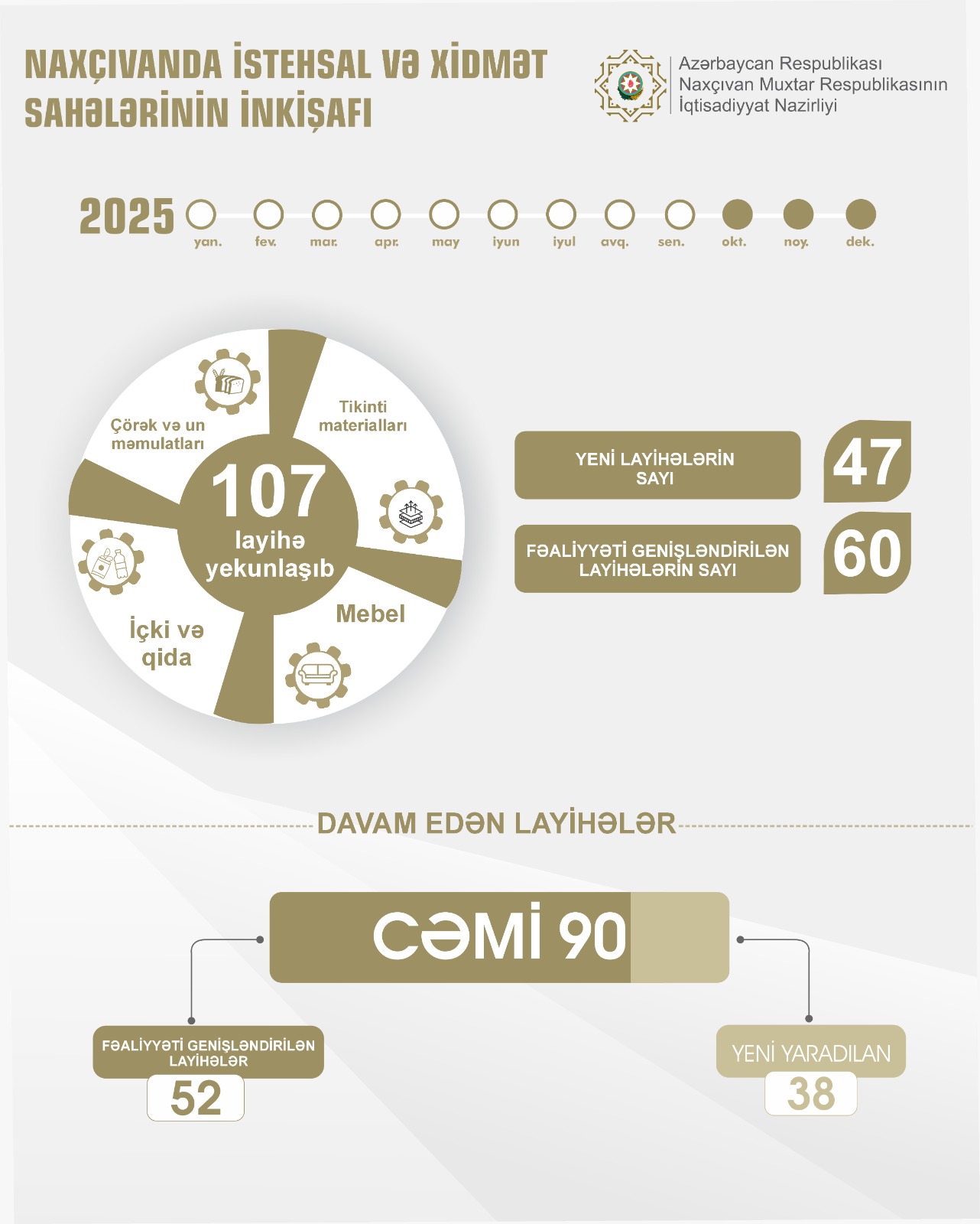 Naxçıvan Muxtar Respublikasında hər bir rayonunun əmək və xammal ehtiyatlarından səmərəli istifadə yolu ilə yeni istehsal və xidmət sahələrinin yaradılması davam etdirilir. Bu istiqamətdə həyata keçirilən layihələr nəticəsində 2025-ci ilin yanvar-sentyabr ayları ərzində müxtəlif təyinatlı 107 istehsal və xidmət sahəsi fəaliyyətə başlayıb.