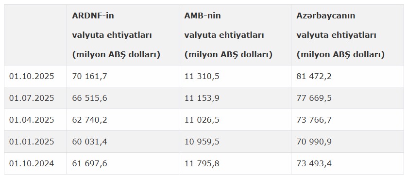 Bu il oktyabrın 1-nə Azərbaycanın strateji valyuta ehtiyatları 81 milyard 472,2 milyon ABŞ dolları təşkil edib.